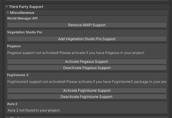 We will need to Add Support for both the World Manager API and the Vegetation Studio Pro. This allows the system to work specifically with those items.
