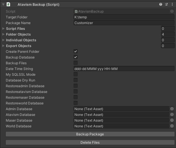 These are individual scripts that you want to add to the backup system. An example would be a file somewhere in the Atavism structure. Since we don’t want to back up this entire structure this allows you to cherry pick scripts from the folder structure.
