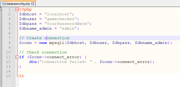 Modify the databaseconfig.php file in /opt/servercheck to have the proper username and password that we created earlier. We will use the gamechecker user in this case that was created during the mysql configuration above. In the top of both files is the section to modify.