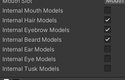 On some models there is no tusk model that is created, but you might want to add one to the character. However, there is usually a slot designed specifically for this purpose on the model. In others the prefabs for the mouths are inside the model as a single prefab. This toggle allows you to select whether the parts are all inside the same model, if so checkmark this toggle. If the model parts are outside of the model and sitting in a folder, the untick this selection. If they are external prefabs, then you will need to make sure the mounting point is setup correctly in your character models.