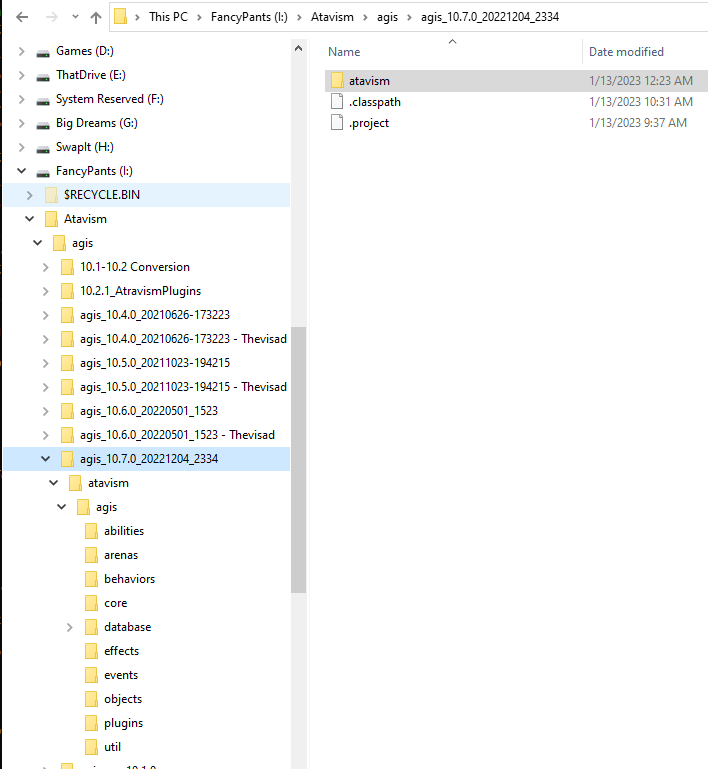 In order to compile the AGIS, two sources will be needed. The first is included Atavism Server and the second is the AGIS itself. Extract the AGIS to a folder somewhere on a drive, add a second extraction that will not be modified for comparison. In the image below the folders tagged Thevisad have modifications and the untagged folders are unmodified.