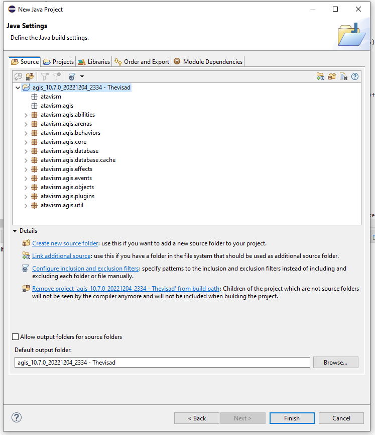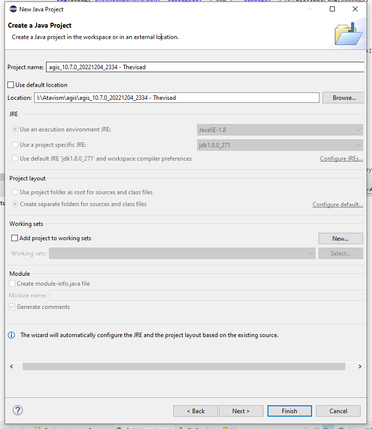 Selecting the Location will load the AGIS project in that folder and select the JRE to use. Click Finish to create the project.