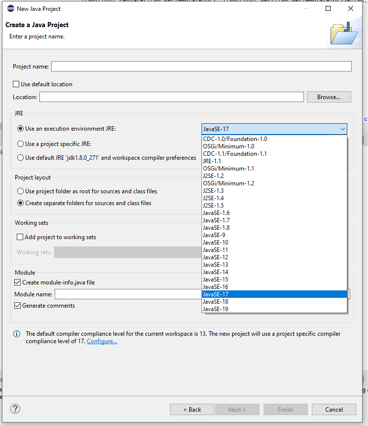 Once the project has been built, right click the project and select properties. This is where the Java compiler version can be changed. Select the proper version for the toolchain to build the project.