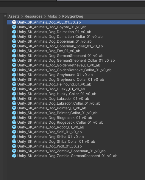 Mob resources are either marked with an ab for all asset bundle items or an ao for addressable objects. This will be your atavism object when working with prefabs from your asset packs.