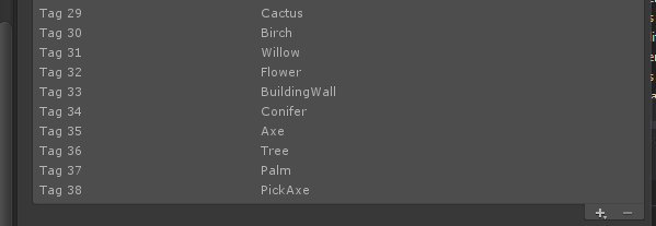 For each of the harvestable objects and tool types you will be creating you will need to create a tag to correspond with that item. Here I have examples of various types of items that are in the harvestable objects. This system supports anything as a harvestable object with this method. The system will not function properly without these as tags are used throughout.