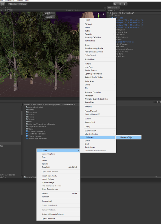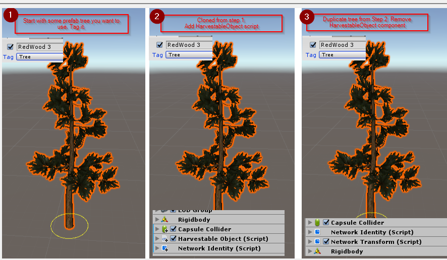 There are three models that are required for this to function properly. For this example, we are using a tree; however, this can be used for rocks or any other object type you are wanting to harvest. Scene objects are not needed for direct harvestable objects spawned into the scene and are only used for single player items (typically vegetation) you wish to replace. In all of them, the scripts and options will be applied to the parent gameobject.