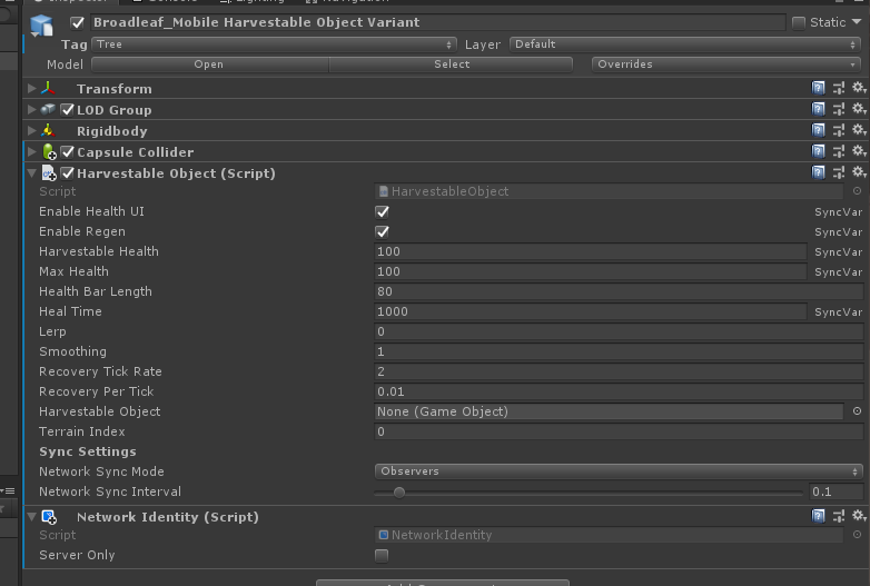 Second, create a prefab from this one and add the Harvestable Object script to it. This will add the Network Identity script as required. Colliders are added by default, so any collider added will assist in the detection of the item.