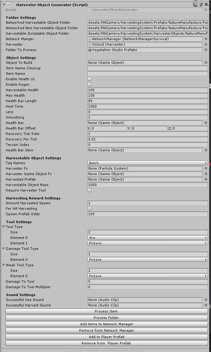 The object generator is a perfect way to quickly and easily setup individual or whole folders of harvestable prefabs. Using the generator you can define all the values for an individual item and it will create the needed prefabs and item file to load all items. Add your Harvester and Network Manager to have it fill in the items you generate.